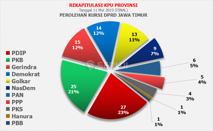 Berikut perolehan kursi berdasarkan Partai Politik untuk DPRD Jawa Timur;